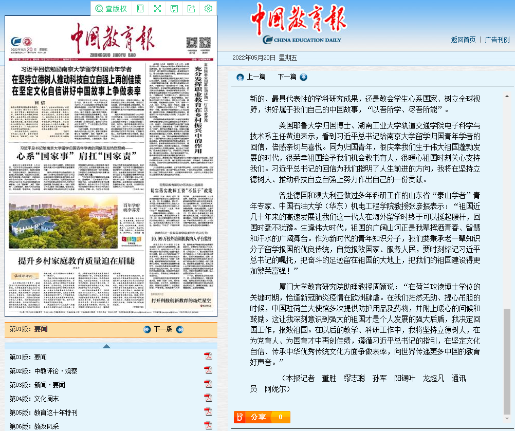 美国耶鲁大学归国博士、我院电子科学与技术系主任黄迪表示,看到习近平总书记给南京大学留学归国青年学者的回信,倍感亲切与喜悦。同为归国青年,很庆幸我们生于伟大祖国蓬勃发展的时代,很荣幸祖国给予我们机会教书育人,很暖心祖国时刻关心支持我们。习近平总书记的回信为我们指明了人生前进的方向,我将在坚持立德树人、推动科技自立自强上努力作出自己的一份贡献。